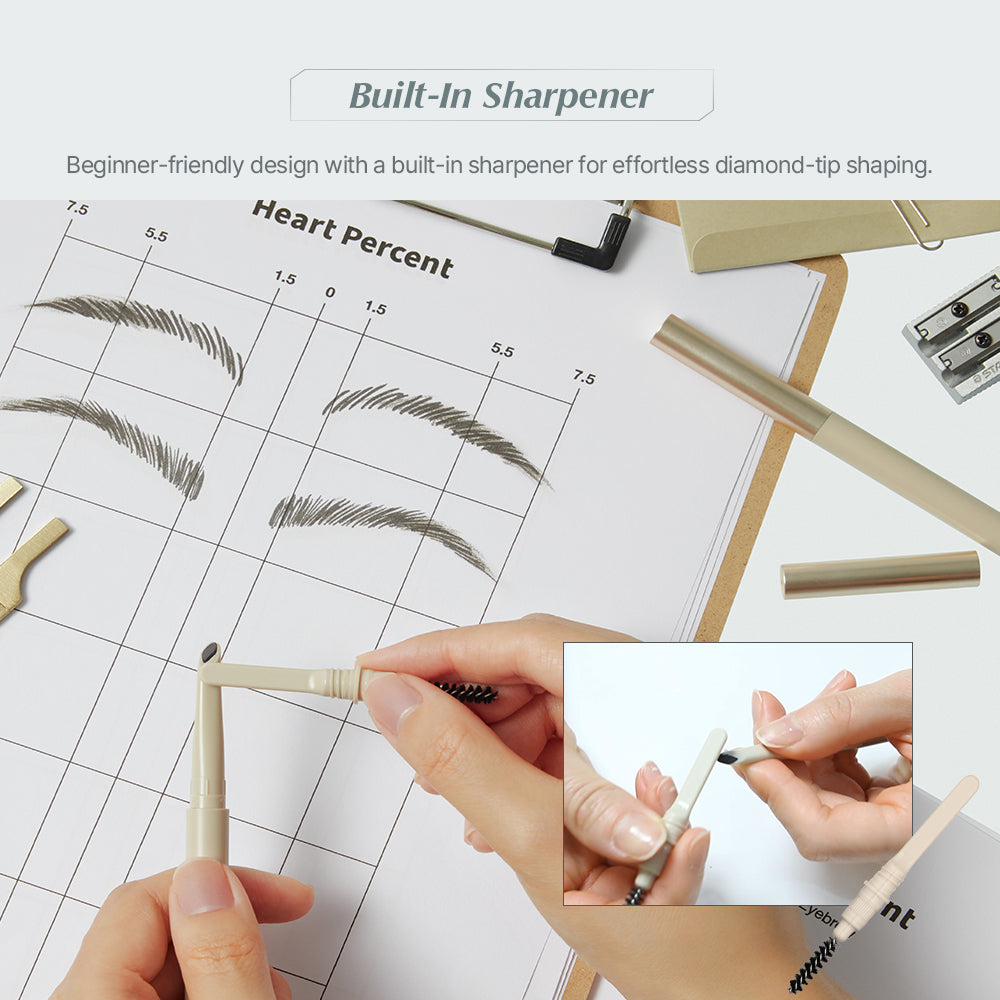 - [Built-In Sharpener] Beginner-friendly eyebrow pencil with a built-in sharpener for easy shaping. If the color payoff is weak or the tip is too sharp, refine it gently. How to use: Twist to reveal the sharpener and shape the tip as needed. *Notice: Extend only a small amount to prevent breakage.