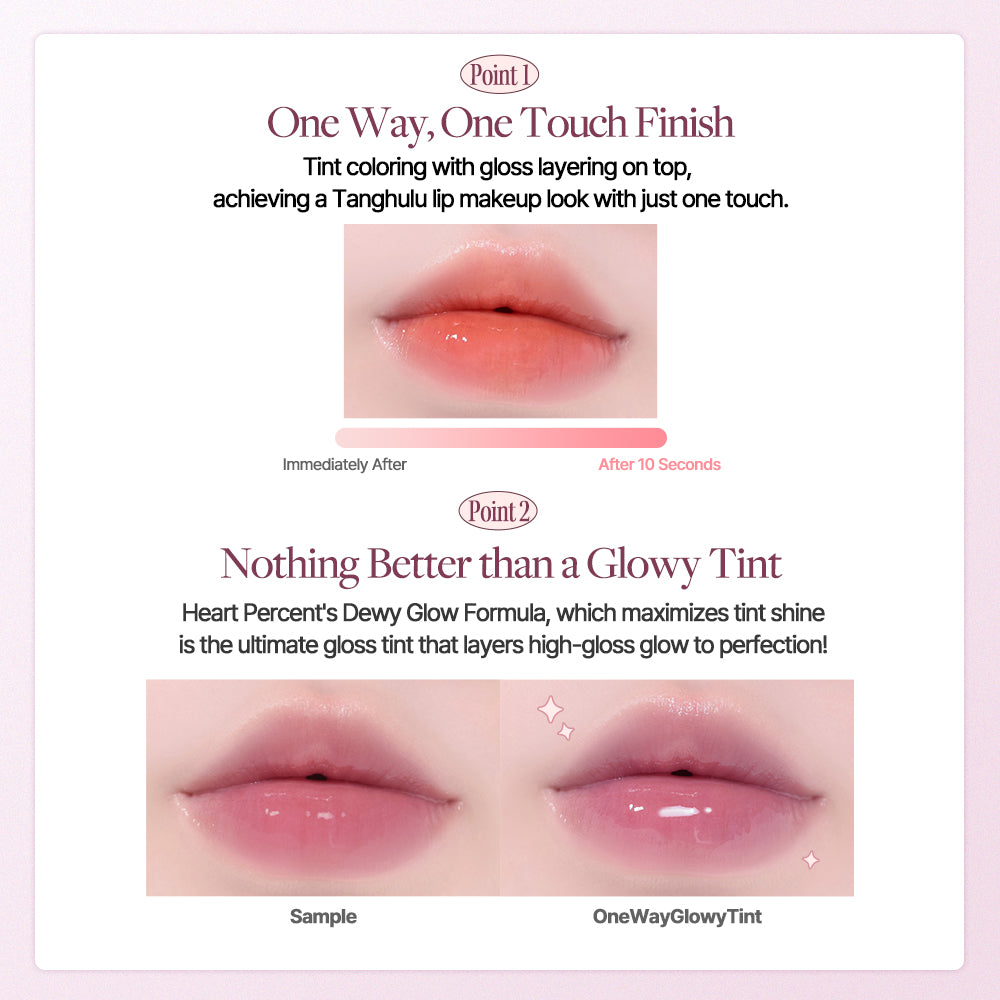 - [Nothing Better than a Glowy Tint] Maximized shine! The ultimate glossy tint. Heart Percent's Dewy Glow Formula, which maximizes tint shine, is the ultimate gloss tint that layers high-gloss glow to perfection!